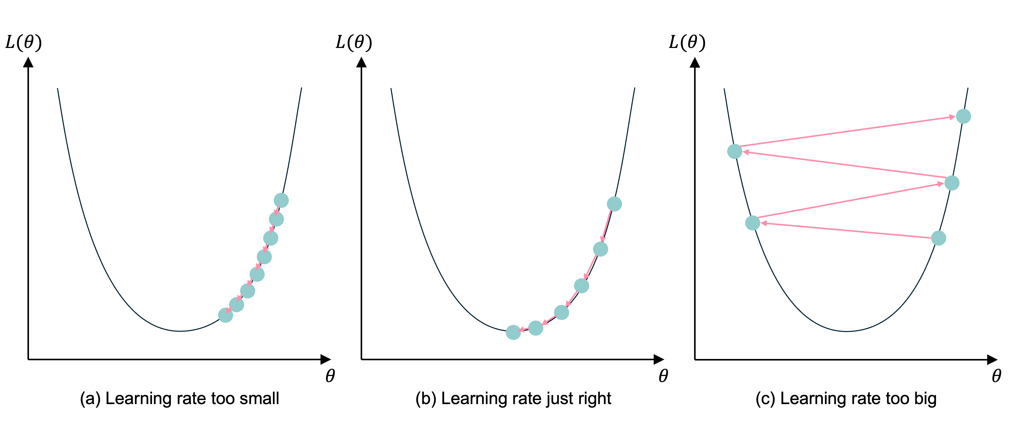 If the learning rate is too small, the subsequent NNs are too similar and it takes too long for the parameters to converge (and more likely to a local, not global, minimum). If the learning rate is too big, you could overshoot and the loss may increase.