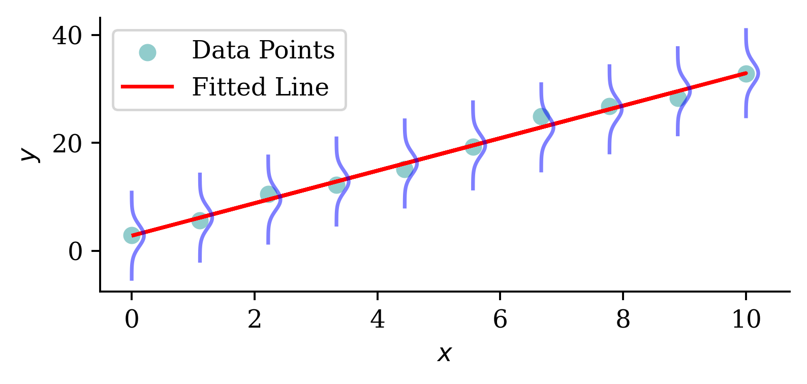 # Generate sample data for linear regressionnp.random.seed(0)X_toy = np.linspace(0, 10, 10)np.random.shuffle(X_toy)beta_0 =2beta_1 =3y_toy = beta_0 + beta_1 * X_toy + np.random.normal(scale=2, size=X_toy.shape)sigma_toy =2# Assuming a standard deviation for the normal distribution# Fit a simple linear regression modelcoefficients = np.polyfit(X_toy, y_toy, 1)predicted_y = np.polyval(coefficients, X_toy)# Plot the data points and the fitted lineplt.scatter(X_toy, y_toy, label='Data Points')plt.plot(X_toy, predicted_y, color='red', label='Fitted Line')# Draw the normal distribution bell curve sideways at each data pointfor i inrange(len(X_toy)): mu = predicted_y[i] y_values = np.linspace(mu -4*sigma_toy, mu +4*sigma_toy, 100) x_values = stats.norm.pdf(y_values, mu, sigma_toy) + X_toy[i] plt.plot(x_values, y_values, color='blue', alpha=0.5)plt.xlabel('$x$')plt.ylabel('$y$')plt.legend()