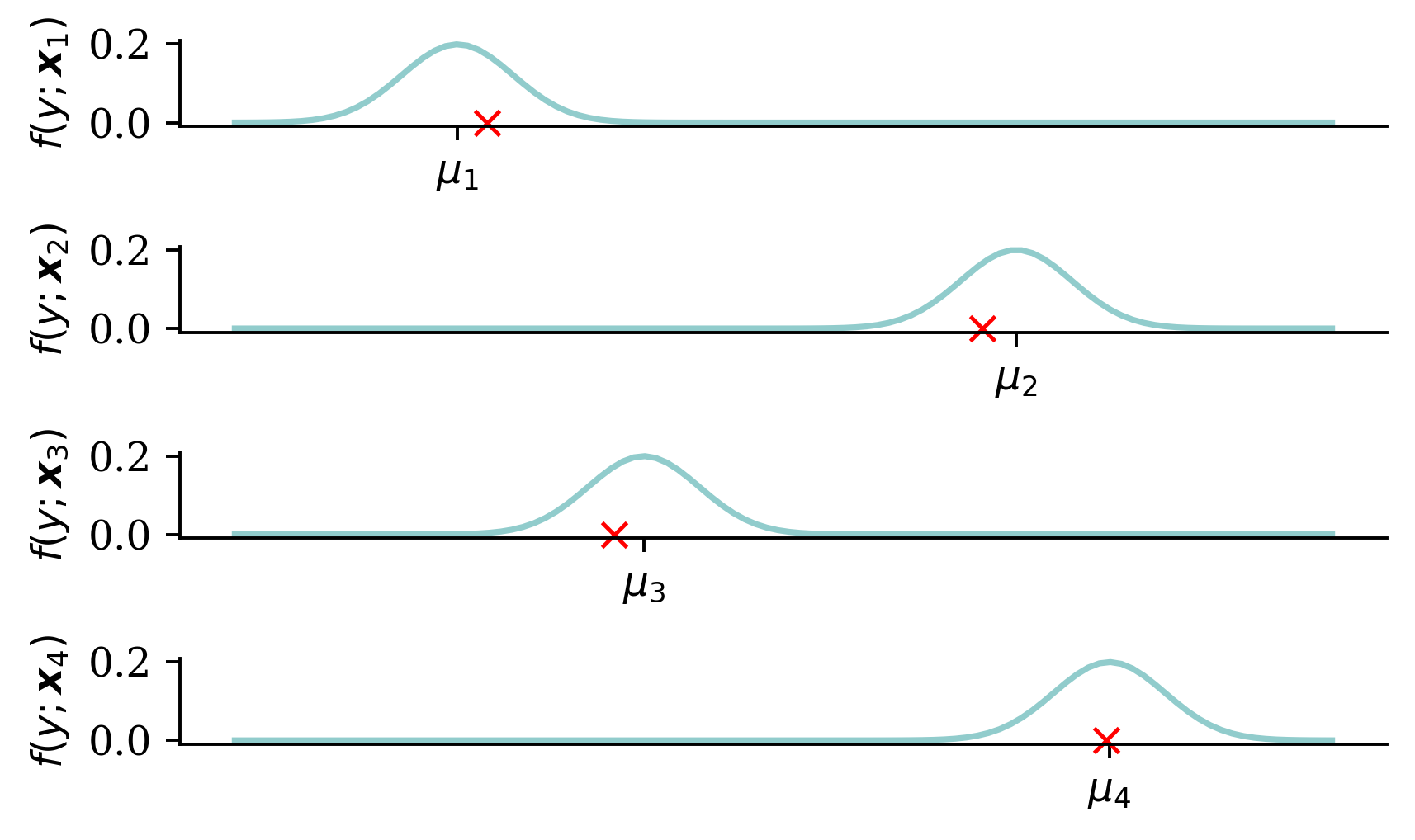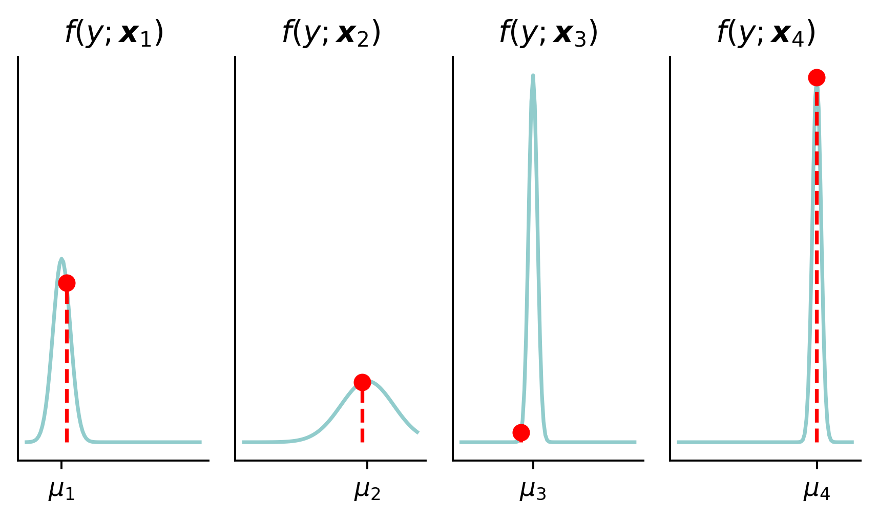 y_pred = np.polyval(coefficients, X_toy[:4])y_pred[2] *=1.1sigma_preds = sigma_toy * np.array([1.0, 3.0, 0.5, 0.5])fig, axes = plt.subplots(1, 4, figsize=(5.0, 3.0), sharey=True)x_min = y_pred[:4].min() -4*sigma_toyx_max = y_pred[:4].max() +4*sigma_toyx_grid = np.linspace(x_min, x_max, 100)# Plot each normal distribution with different means verticallyfor i, ax inenumerate(axes): y_grid = stats.norm.pdf(x_grid, y_pred[i], sigma_preds[i]) ax.plot(x_grid, y_grid) ax.plot([y_toy[i], y_toy[i]], [0, stats.norm.pdf(y_toy[i], y_pred[i], sigma_preds[i])], color='red', linestyle='--') ax.scatter([y_toy[i]], [stats.norm.pdf(y_toy[i], y_pred[i], sigma_preds[i])], color='red', zorder=10) ax.set_title(f'$f(y ; \\boldsymbol{{x}}_{{{i+1}}})$') ax.set_xticks([y_pred[i]], labels=[r'$\mu_{'+str(i+1) +r'}$'])# ax.set_ylim(0, 0.25)# Turn off the y axes ax.yaxis.set_visible(False)plt.tight_layout();
