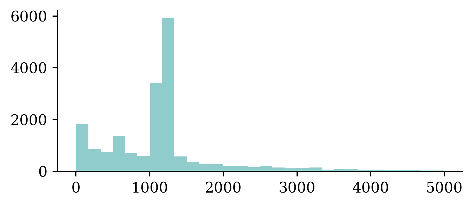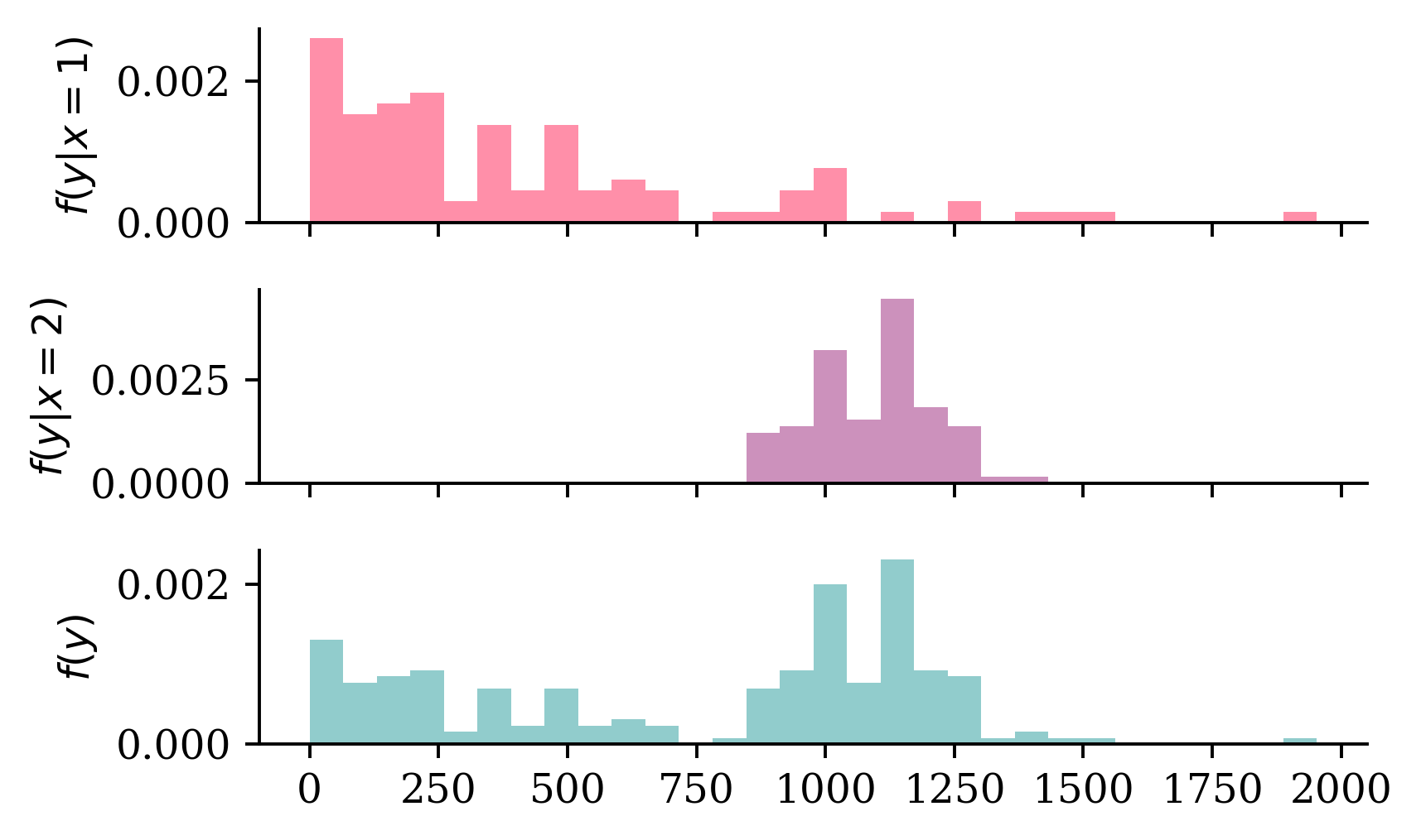 # Make some example where the distribution is multimodal because of a binary covariate which separates the means of the two distributionsnp.random.seed(1)fig, axes = plt.subplots(3, 1, figsize=(5.0, 3.0), sharex=True)x_min =0x_max = y_train.max()x_grid = np.linspace(x_min, x_max, 100)# Simulate some data from an exponential distribution which has Pr(X < 1000) = 0.9n =100p =0.1lambda_ =-np.log(p) /1000mu =1/ lambda_y_1 = np.random.exponential(scale=mu, size=n)# Pick a truncated normal distribution with a mean of 1100 and std of 250 (truncated to be positive)mu =1100sigma =100y_2 = stats.truncnorm.rvs((0- mu) / sigma, (np.inf - mu) / sigma, loc=mu, scale=sigma, size=n)# Combine y_1 and y_2 for the final histogramy = np.concatenate([y_1, y_2])# Determine common binsbins = np.histogram_bin_edges(y, bins=30)# Plot each normal distribution with different means verticallyfor i, ax inenumerate(axes):if i ==0: ax.hist(y_1, bins=bins, density=True, color=colors[i+1]) ax.set_ylabel(f'$f(y | x = 1)$')elif i ==1: ax.hist(y_2, bins=bins, density=True, color=colors[i+1]) ax.set_ylabel(f'$f(y | x = 2)$')else: ax.hist(y, bins=bins, density=True) ax.set_ylabel(f'$f(y)$')plt.tight_layout();