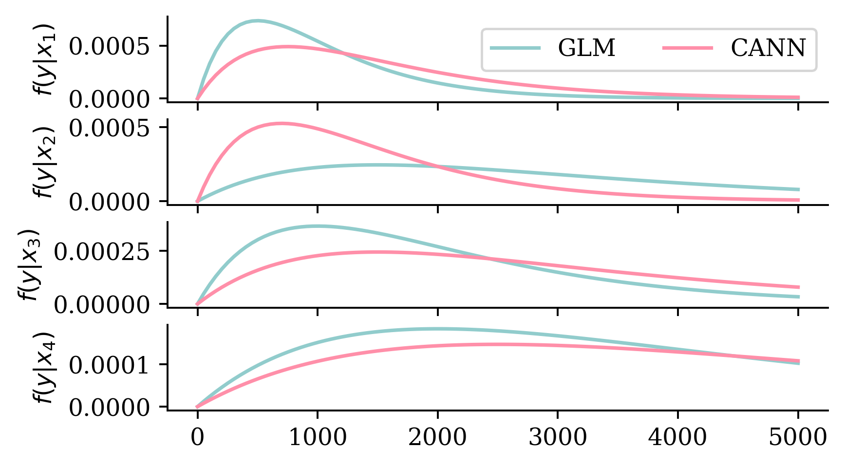 # Ensure reproducibilityrandom.seed(1)# Make a 4x1 grid of plotsfig, axes = plt.subplots(4, 1, figsize=(5.0, 3.0), sharex=True)# Define the x-axisx_min =0x_max =5000x_grid = np.linspace(x_min, x_max, 100)# Plot a few Gamma distribution pdfs with different means.# Then plot Gamma distributions with shifted means and the same dispersion parameter.glm_means = [1000, 3000, 2000, 4000]cann_means = [1500, 1400, 3000, 5000]for i, ax inenumerate(axes): ax.plot(x_grid, stats.gamma.pdf(x_grid, a=2, scale=glm_means[i]/2), label=f'GLM') ax.plot(x_grid, stats.gamma.pdf(x_grid, a=2, scale=cann_means[i]/2), label=f'CANN') ax.set_ylabel(f'$f(y | x_{i+1})$')if i ==0: ax.legend(["GLM", "CANN"], loc="upper right", ncol=2)