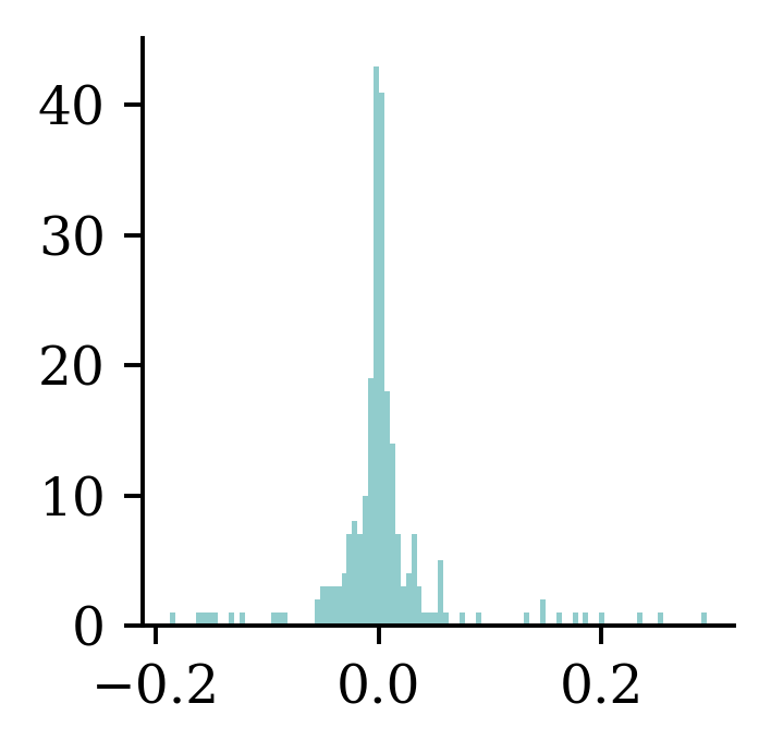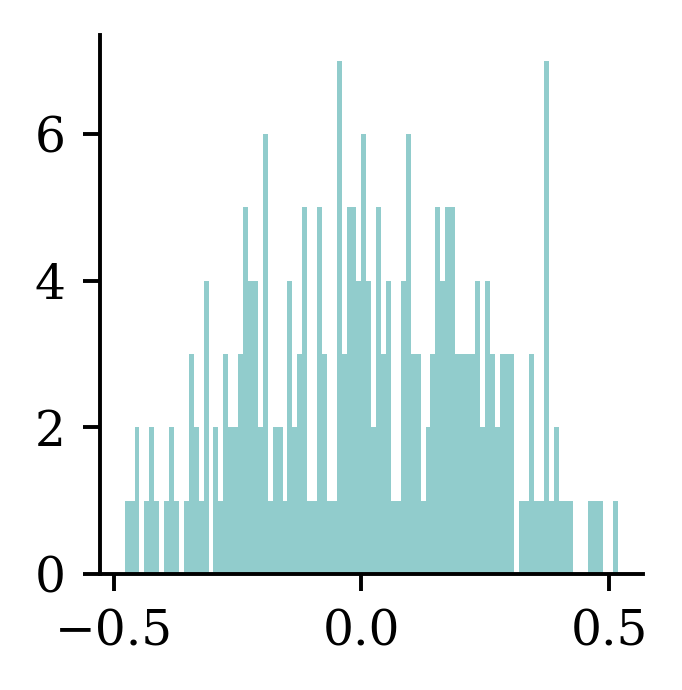 model = l2_model(1.0)weights = model.layers[0].get_weights()[0].flatten()print(f"Number of weights almost 0: {np.sum(np.abs(weights) <1e-5)}")plt.hist(weights, bins=100);