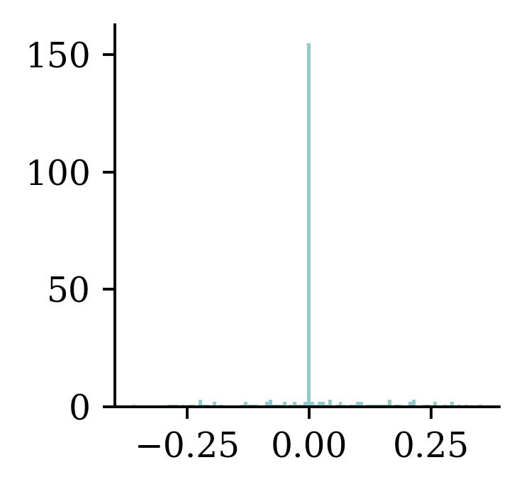 model = l1_model(1.0)weights = model.layers[0].get_weights()[0].flatten()print(f"Number of weights almost 0: {np.sum(np.abs(weights) <1e-5)}")plt.hist(weights, bins=100);