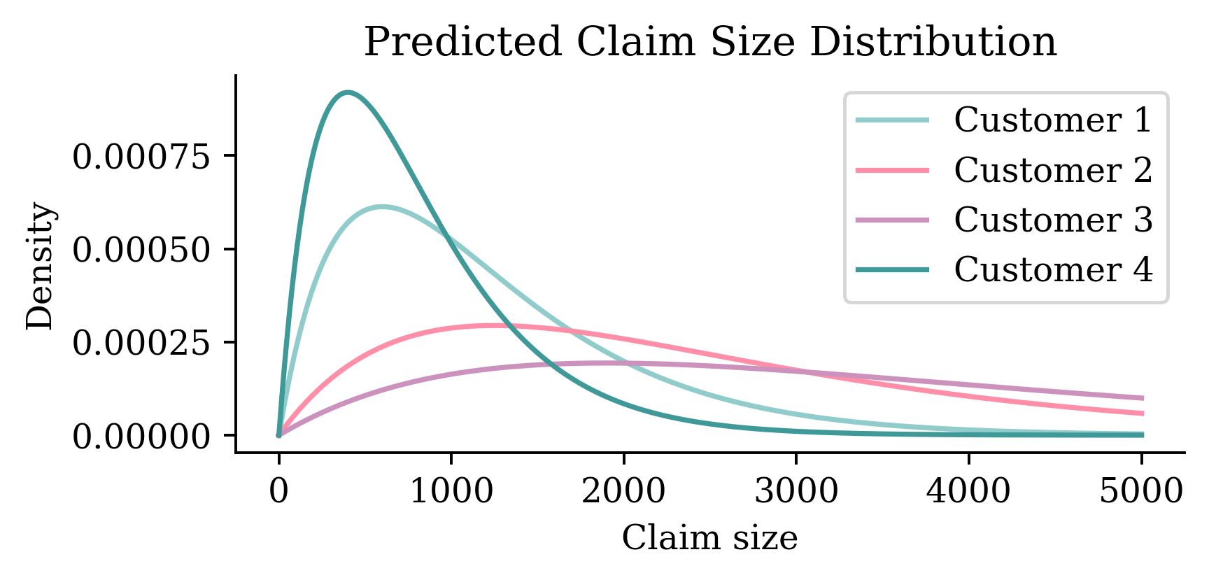 # Plot all on the same graphplt.figure()for i, (age, car_age, car_type, cost) inenumerate(data): mean = cost shape =2# Example shape parameter for the gamma distribution scale = mean / shape # Scale parameter to achieve the correct mean plt.plot(x, stats.gamma.pdf(x, a=shape, scale=scale), label=f"Customer {i+1}", color=colors[i])plt.title(f"Predicted Claim Size Distribution")plt.xlabel("Claim size")plt.ylabel("Density")plt.legend()