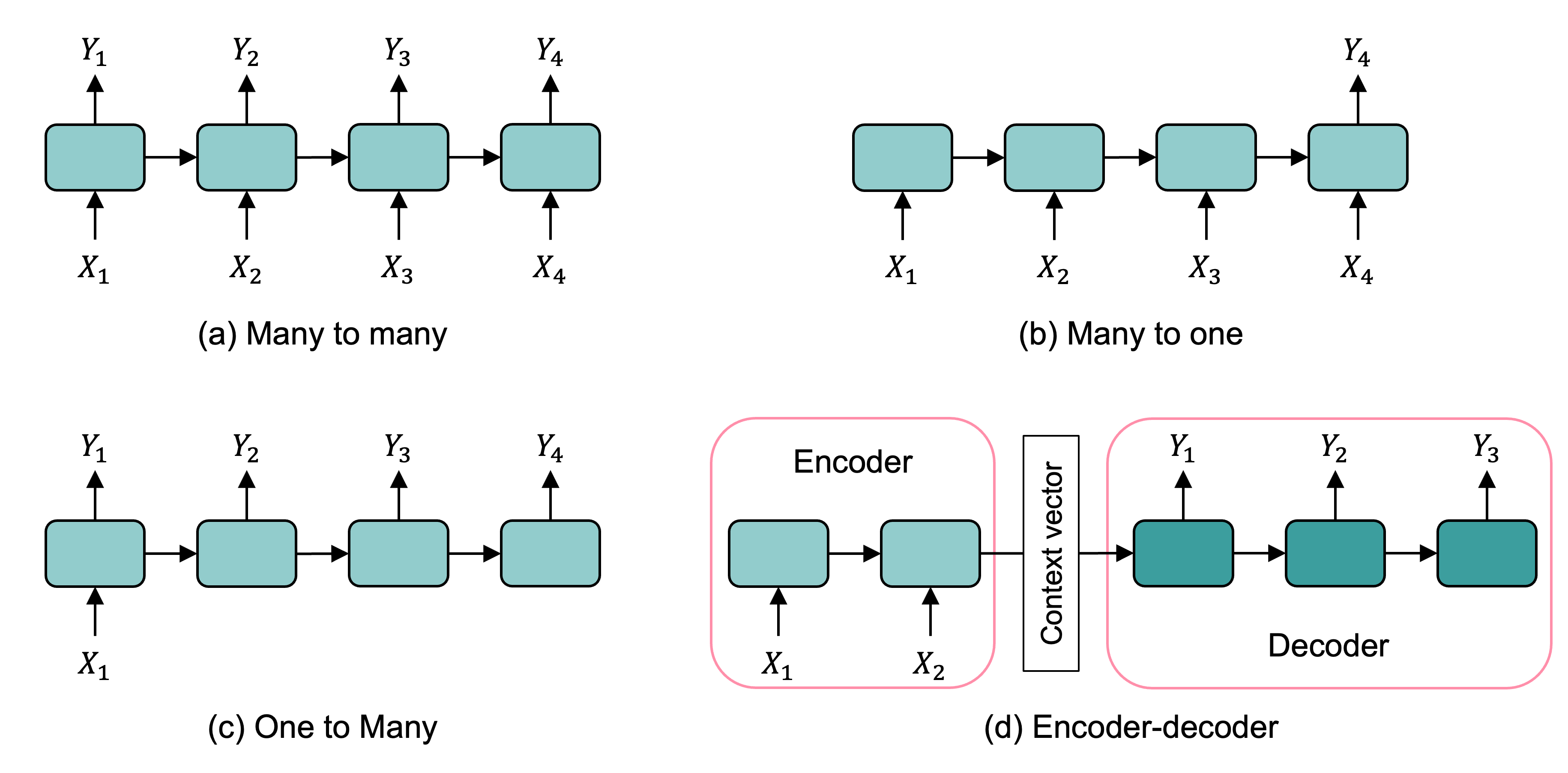 Categories of recurrent neural networks: sequence to sequence, sequence to vector, vector to sequence, encoder-decoder network.