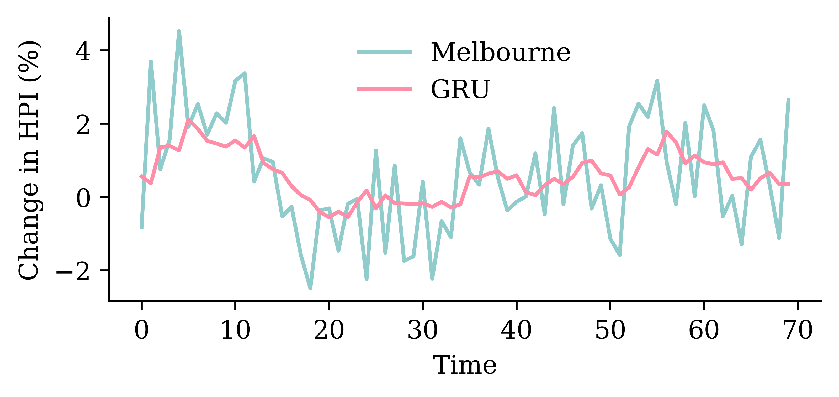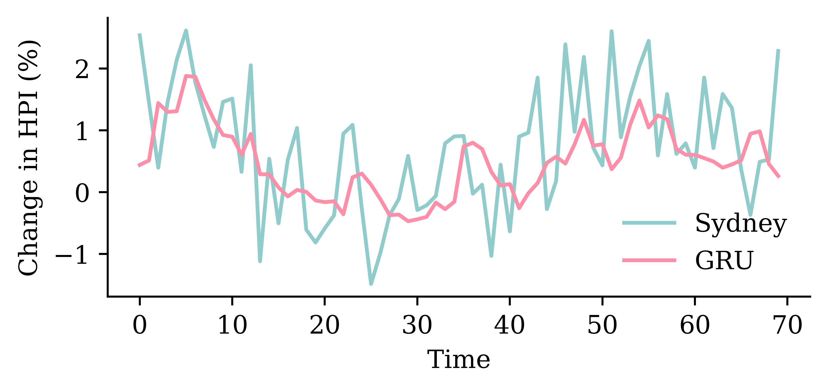 y_pred = model_gru.predict(X_val, verbose=0)plt.plot(y_val, label="Sydney")plt.plot(y_pred, label="GRU")plt.xlabel("Time")plt.ylabel("Change in HPI (%)")plt.legend(frameon=False);