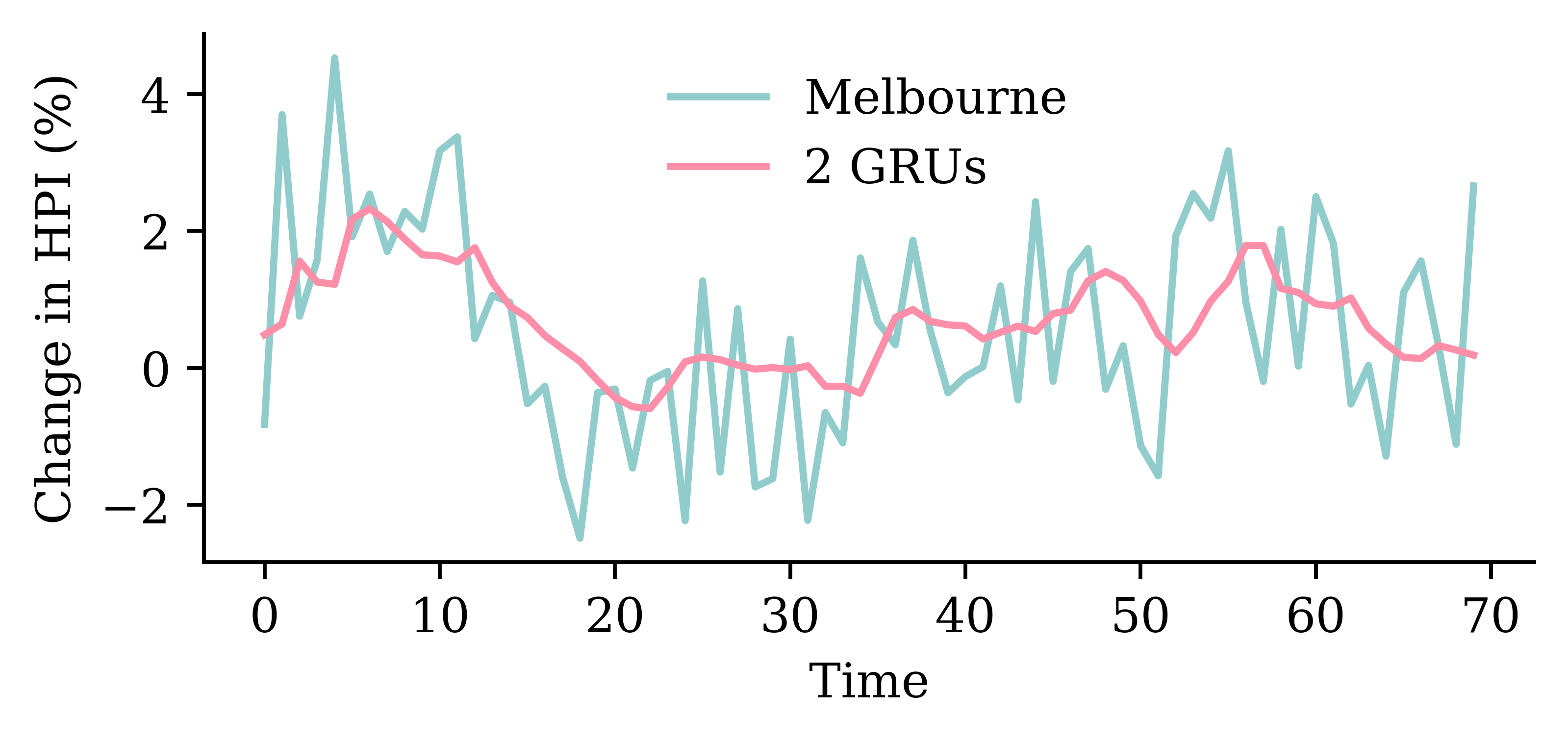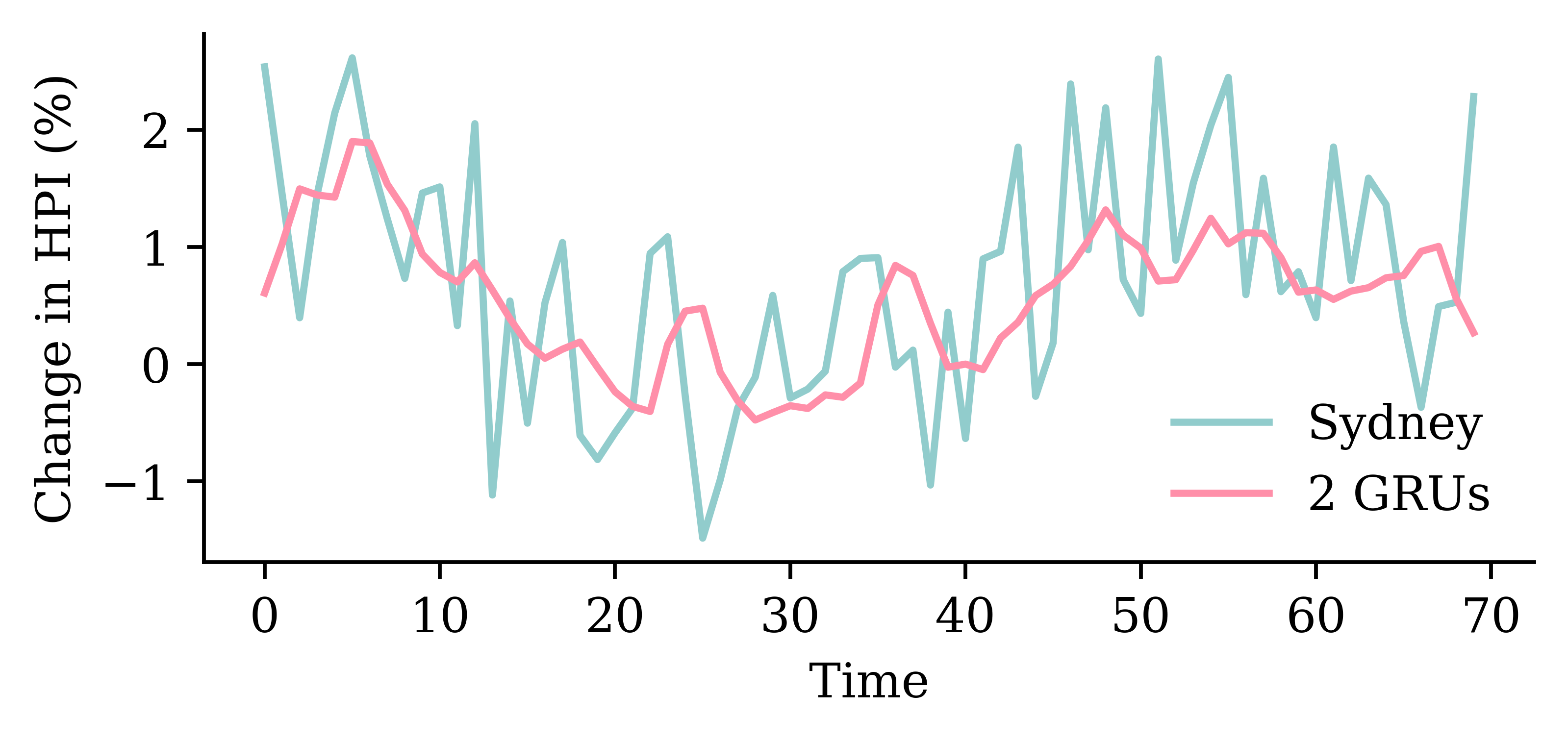 y_pred = model_two_grus.predict(X_val, verbose=0)plt.plot(y_val, label="Sydney")plt.plot(y_pred, label="2 GRUs")plt.xlabel("Time")plt.ylabel("Change in HPI (%)")plt.legend(frameon=False);