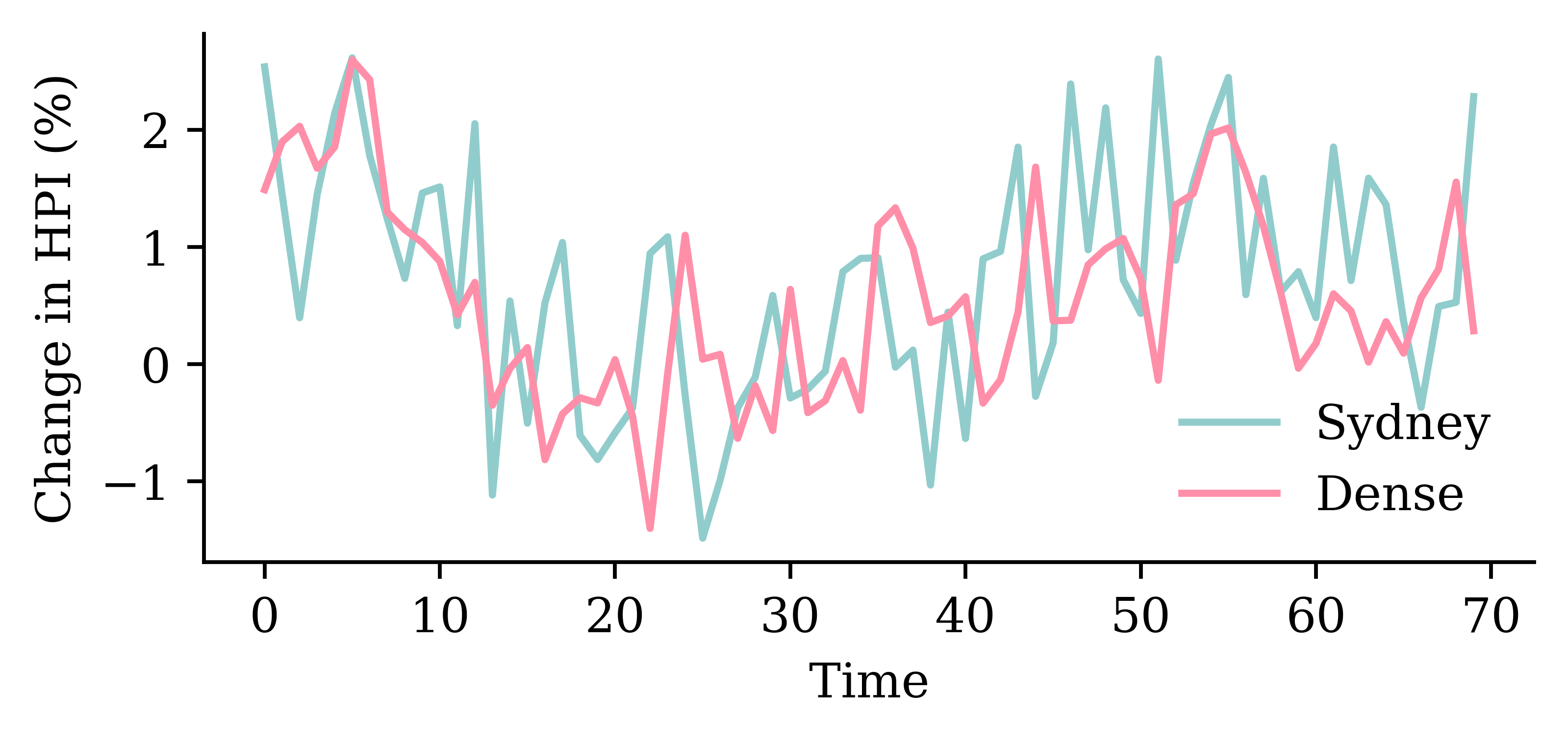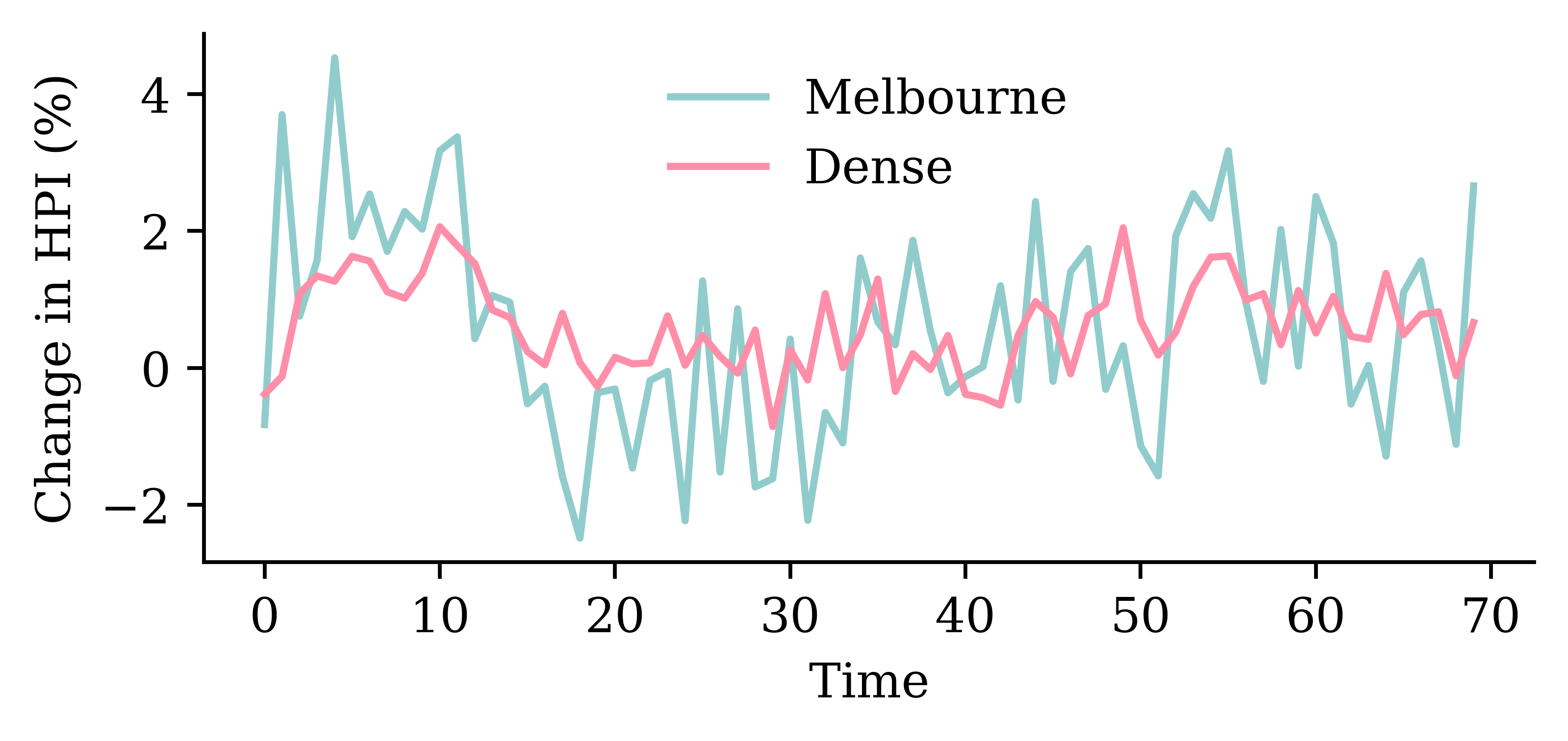 y_pred = model_dense.predict(X_val, verbose=0)plt.plot(y_val, label="Sydney")plt.plot(y_pred, label="Dense")plt.xlabel("Time")plt.ylabel("Change in HPI (%)")plt.legend(frameon=False);