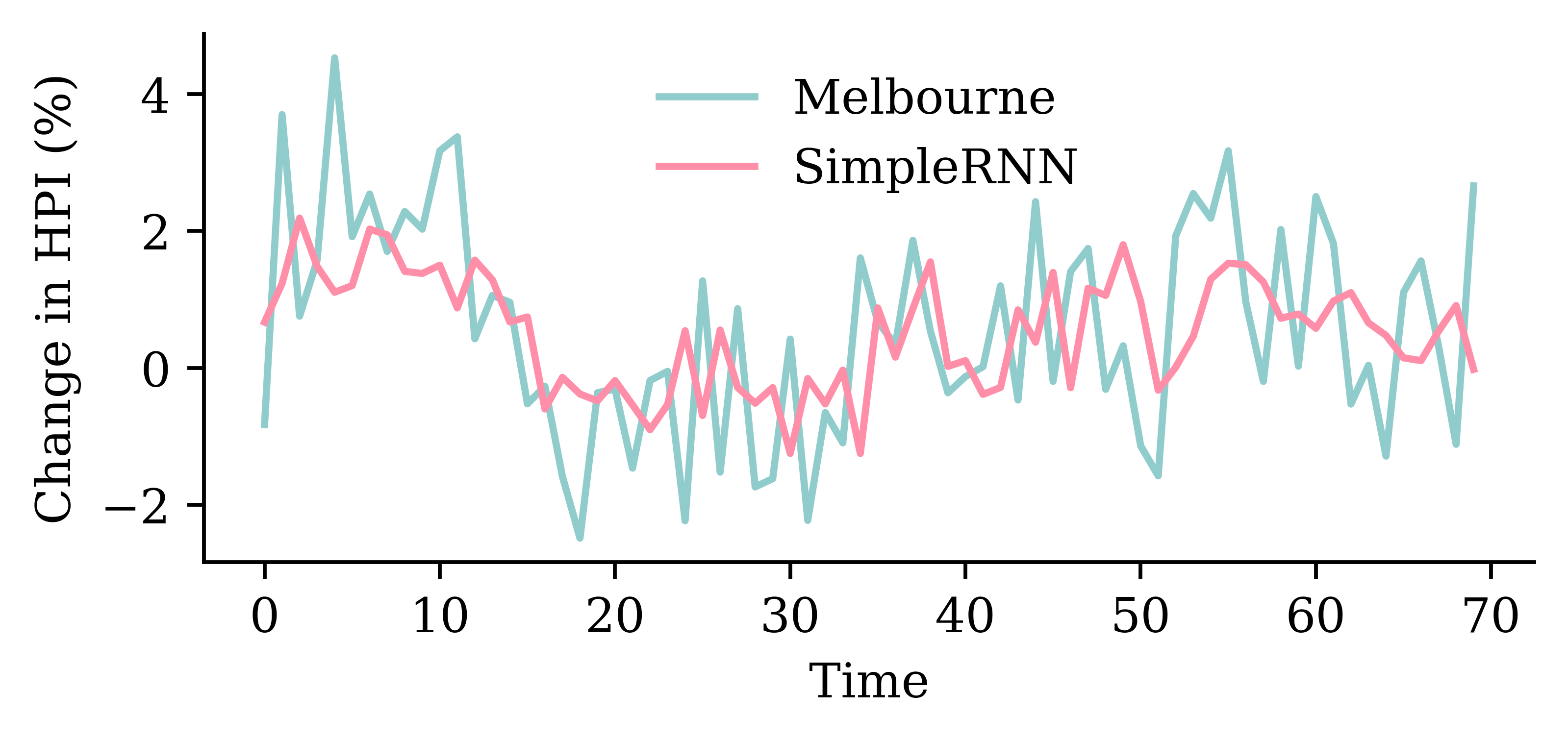y_pred = model_simple.predict(X_val, verbose=0)plt.plot(y_val, label="Sydney")plt.plot(y_pred, label="SimpleRNN")plt.xlabel("Time")plt.ylabel("Change in HPI (%)")plt.legend(frameon=False);