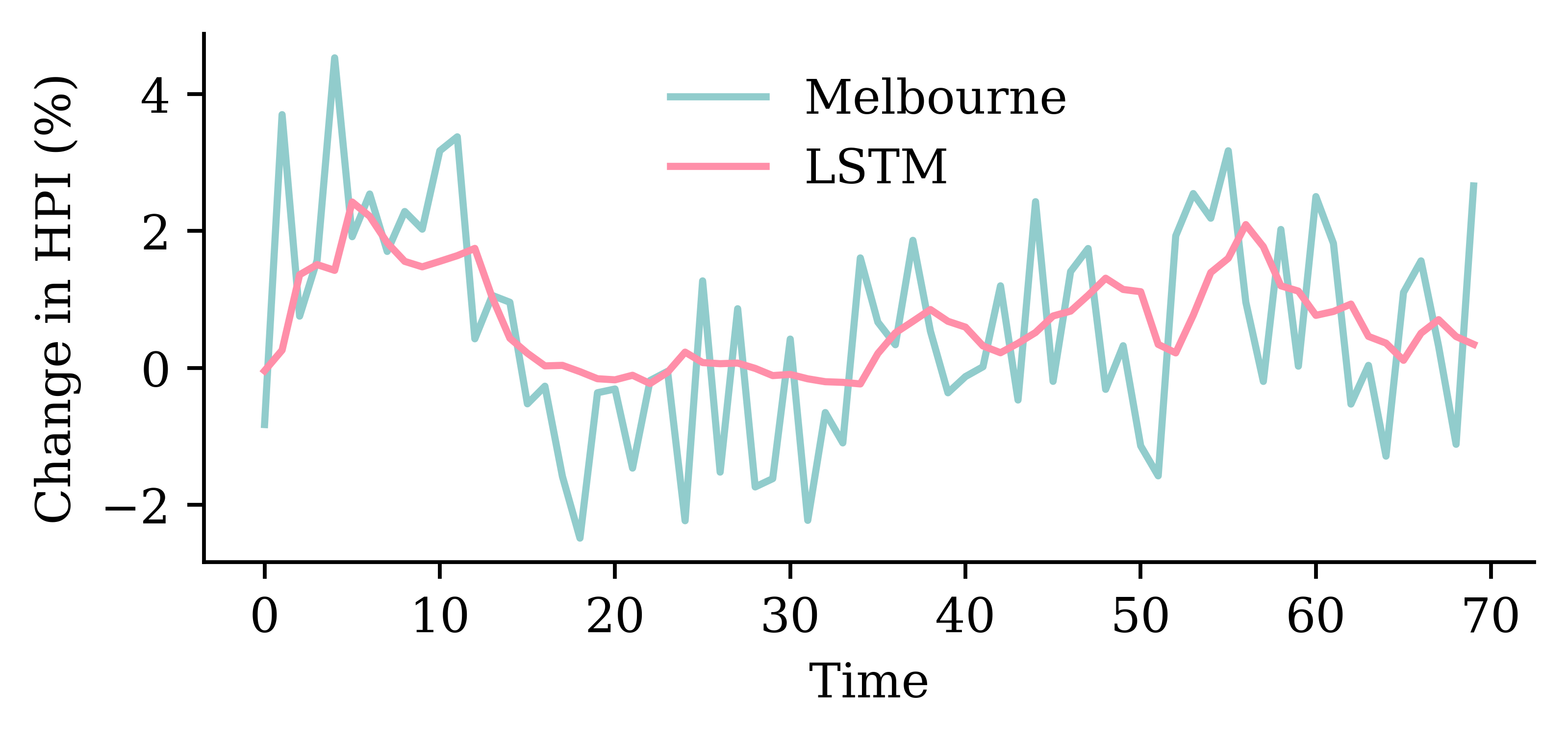 y_pred = model_lstm.predict(X_val, verbose=0)plt.plot(y_val, label="Sydney")plt.plot(y_pred, label="LSTM")plt.xlabel("Time")plt.ylabel("Change in HPI (%)")plt.legend(frameon=False);