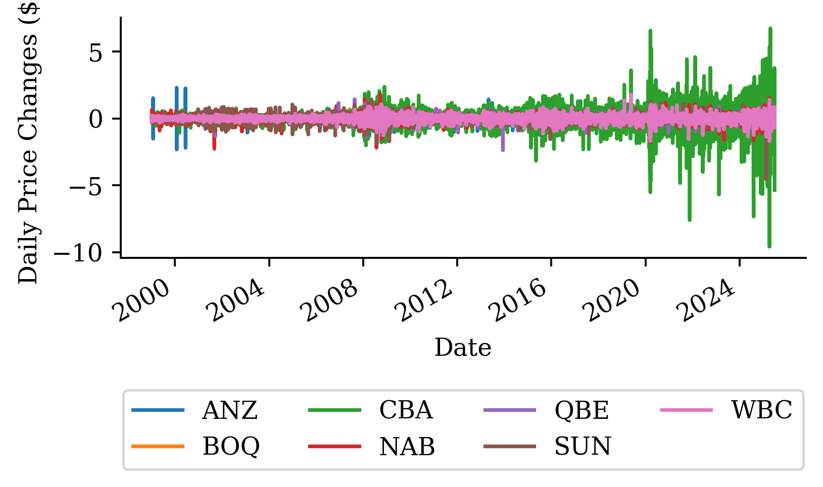 | Date | ANZ | ASX200 | BOQ | CBA | NAB | QBE | SUN | WBC | |